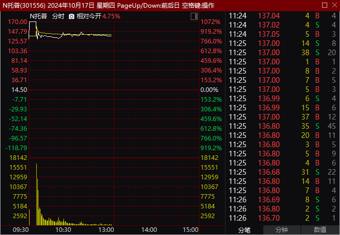 今天a股市场上市了另一只新股,托普云农。该股早上开盘上涨800%。进入连续竞价阶段后,涨幅进一步扩大,盘中涨幅一度超过1000%。由于盘中股价涨幅达到暂停阀值,该股一度暂停,复盘后涨幅有所下降。