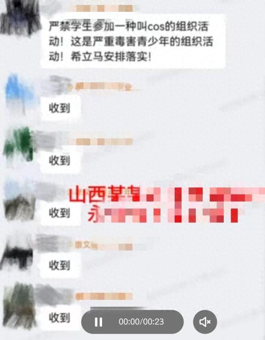 近日,社交平台截图显示,山西省吕梁市孝义市教育科技局工作人员在工作组发布消息称,“禁止学生参加一项名为cos的活动!这是一项严重毒害青少年的活动!立即安排实施。”10月16日,孝义市教育科技局工作人员回应《奔流新闻》记者,称“我没听说过类似的通知”。