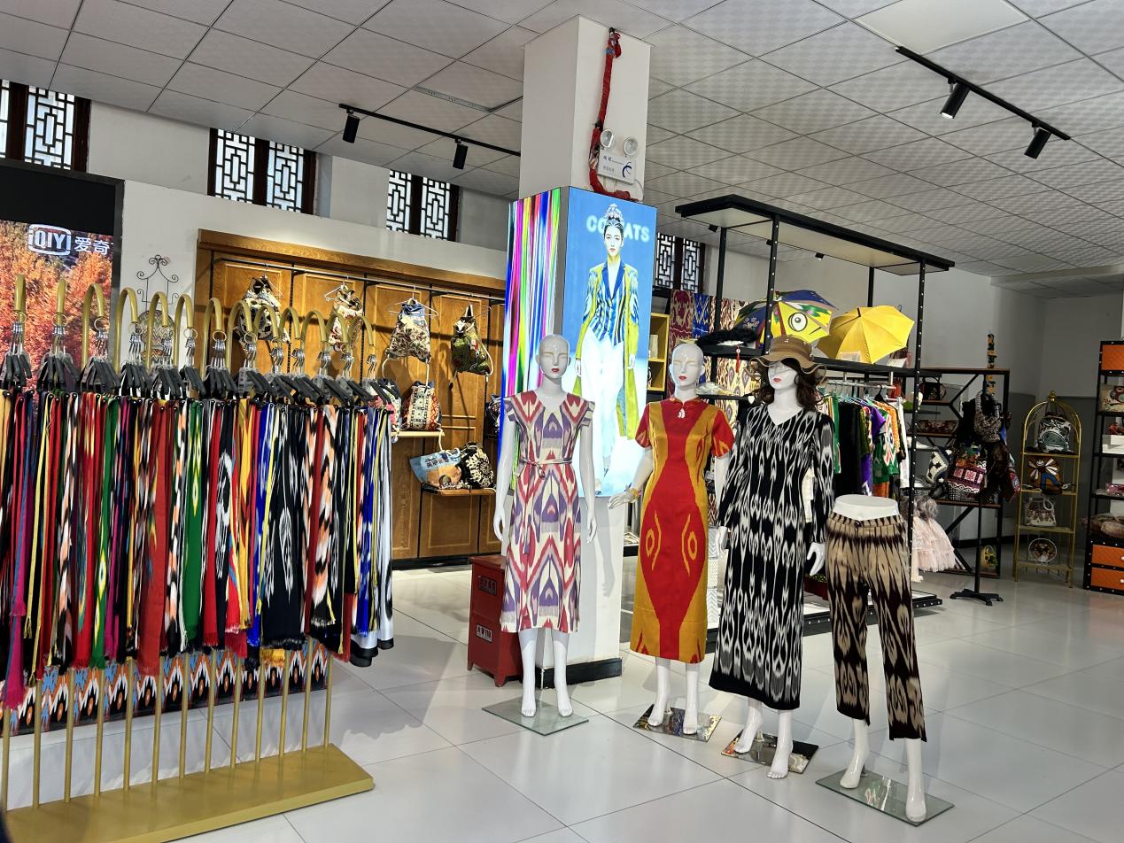 不仅当地人喜欢,游客也喜欢艾德莱斯。当有人来到旅游的第一站时,他们直接去了艾德莱斯商店。位于莎车老城区的艾德莱斯车间吸引了研究小组成员的注意力。展区呈现了许多艾德莱斯元素的服装、裙子、围巾、背包、笔记本等文化创意产品,其中许多是莎车高级技校服装专业学生的作品。