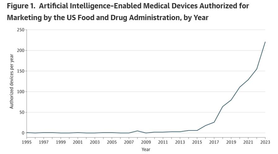 从那时起,FDA 大概已经批准了 1000 种 AI 驱动医疗器械,尤其在放射学和心脏病学领域。