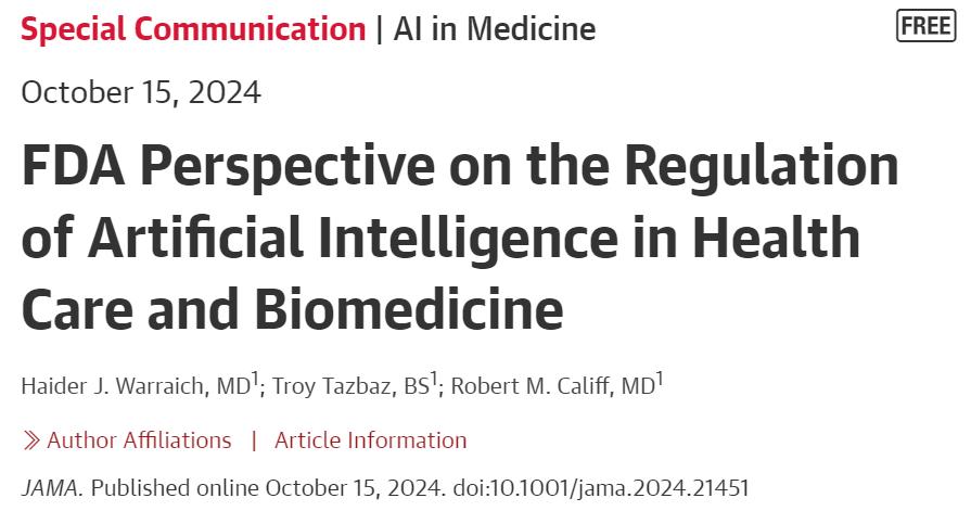 日前,FDA 的 Haider J. Warraich、Troy Tazbaz 和 Robert M. Califf 在 JAMA(四大国际医学期刊之一)系统回顾 FDA 对 AI 监管历史,指出 AI 在医疗产品研发、临床研究和临床护理方面,提出了几种潜在用途,适应监管系统 AI 一个值得在挑战时考虑的独特概念。