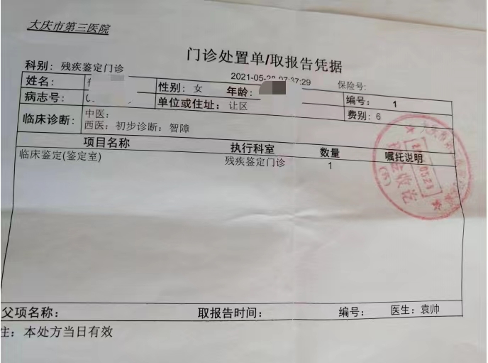 据王先生介绍,2021年,社区工作人员告诉外婆残疾证到期,需要到大庆市第三医院再次审核才能申请新证。根据《ThePaper》提供的门诊处理清单,2021年5月28日,外婆在残疾鉴定门诊进行临床鉴定,初步诊断结果为“智障”。