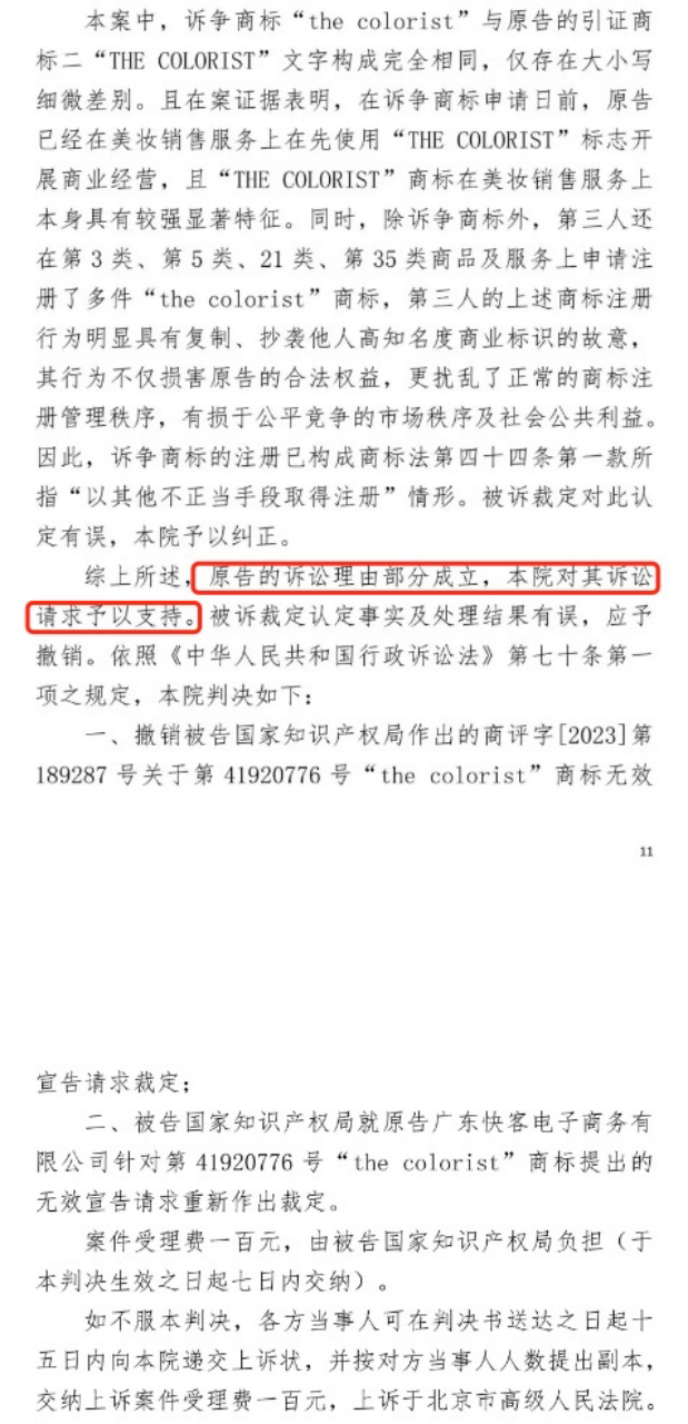 北京知识产权法院于2024年6月25日作出的行政判决认为,首先要争夺商标”the colorist和原告的引证商标“THE COLORIST“文字构成完全一致,只有大小写的微小差别;而且案件数据显示,原告在申请诉讼商标前已经在美容销售中使用了“THE COLORIST进行商业运作,而且这个商标在美容销售上有很强的显著特点;与此同时,第三人(即阿信科技)还申请在第三类、第五类、第21类、第35类商品和服务上注册了多件“the colorist“上述商标行为显然是故意复制和抄袭他人高知名度的商业标志,形成了《商标法》第四十四条第一款关于“以其他不正当手段注册”的案例。