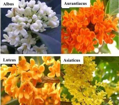 四类:左上 Albus 右上为银桂 Aurantiacus 左下为丹桂 Luteus 右下为金桂 Asiaticus 是四季桂;同一品种群体中的不同品种,颜色也会略有不同。|Lipeng Wu, Junyi Liu, et al. doi.org/10.1016/j.foodchem.2021.131853