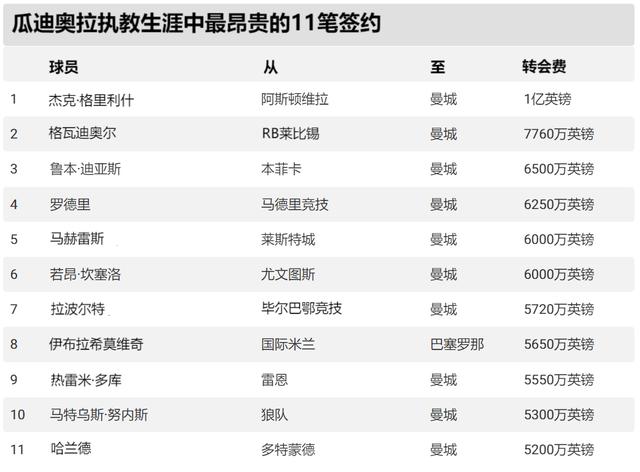 瓜迪奥拉执教生涯中最昂贵的11笔签约!