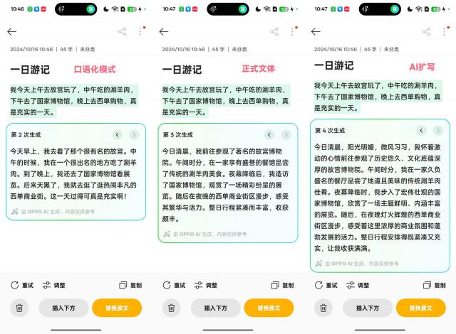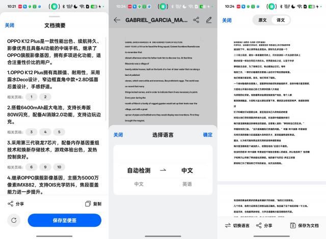 AI 对日常使用效率的提高,有许多因素。这不仅是一本百科全书,而且对办公室也有很大的支持。ColorOS 15 融合了「AI 语音摘要」、「AI 笔记助手」和「AI 文档助手」三大 AI 功能于「音频」、「便签」和「文档」应用程序,专为办公和学习高频场景而设计。