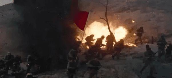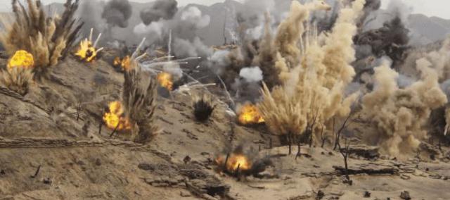 炮火连天,战士们冲锋陷阵,画面恢宏,