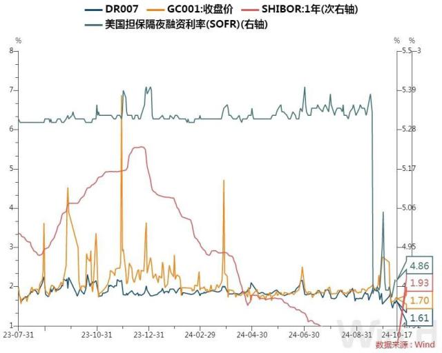 周四,银行间市场资金总体稳定性较宽,隔夜和七天回购利率小幅下降。在海外,美国最新的隔夜融资担保利率是 4.86%。