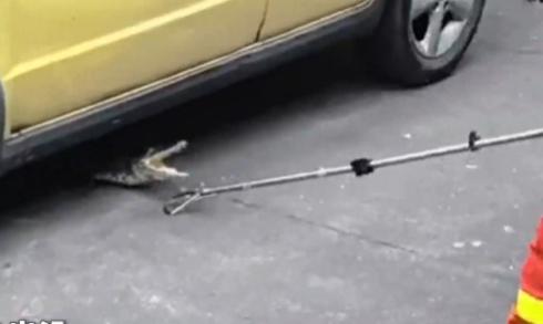 家养宠物鳄鱼偷偷溜到街上 消防队员用铲子抓了一把
