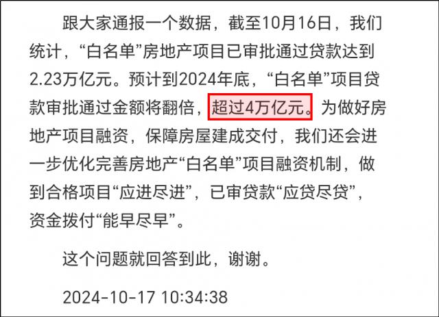 现在白名单房地产项目已经审核通过贷款也达到了贷款。 2.23 预计今年年底项目贷款审批通过额度将超过万亿元。 4 万亿,翻倍,这是坐火箭的速度。