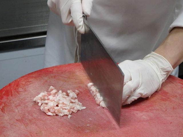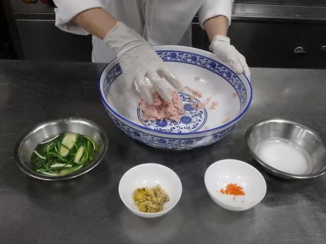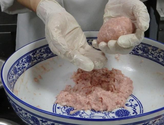 上力后加入手拆蟹粉拌匀,将拌匀的肉末做成约约。 70 克肉丸,并在肉丸上拍摄少量湿淀粉。