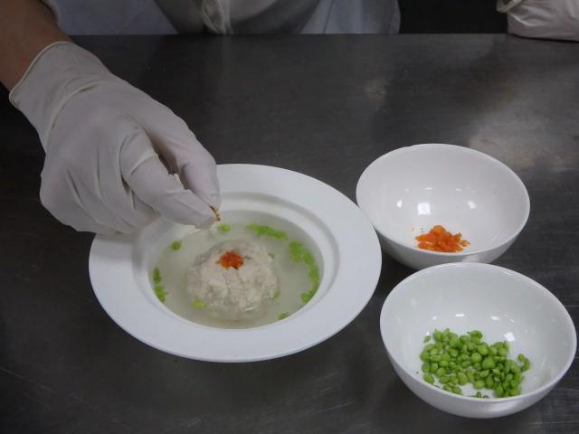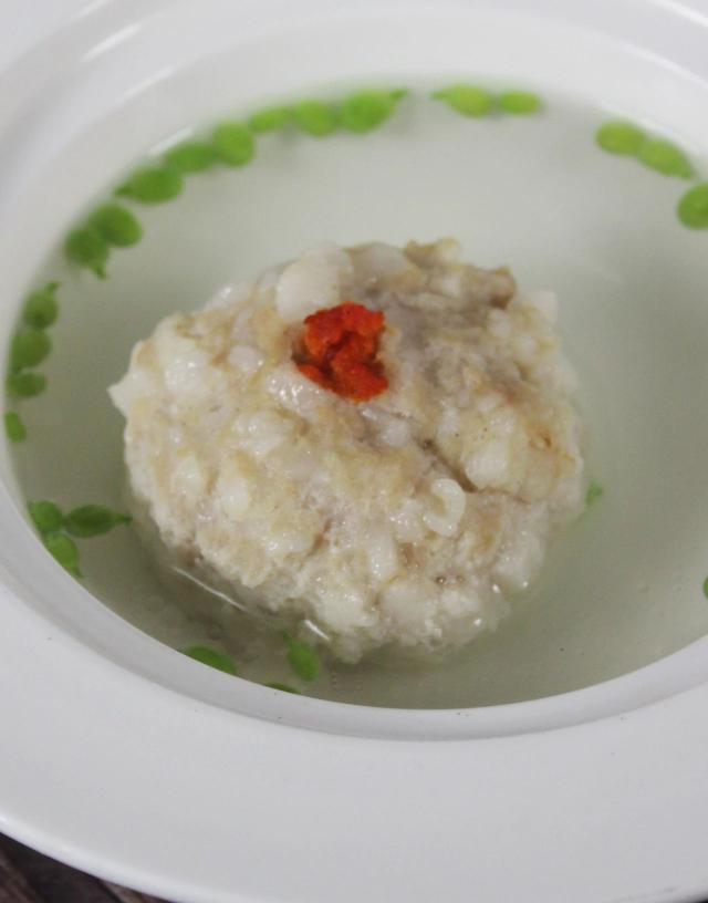 等肉软适味后捞出摆盘,倒入原汁原味的汤汁,在上面镶上蟹黄,撒上少量甜豆粒装饰即可上菜。