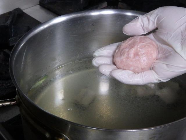 将肉丸放入沸腾的排骨汤中,打去浮沫,转文煨煮。 2 小时。