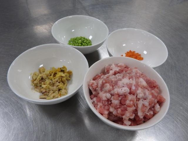配料:五花肉,蟹粉,蟹黄,甜豆粒