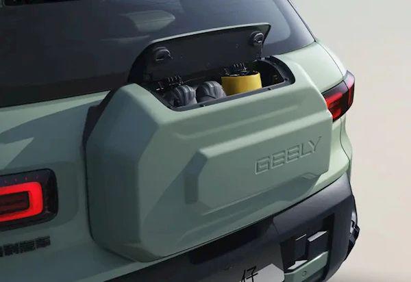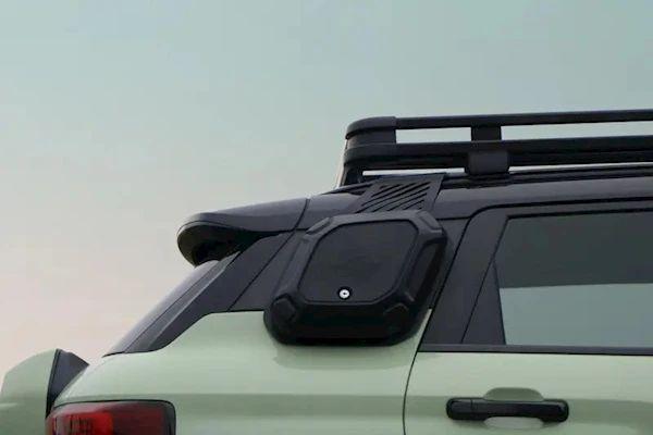 车身侧面设计有宽轮眉、纯黑轮毂和黑色侧裙,轮毂内还配有红色制动卡钳,提升了新车的运动特性。同时,车侧还增加了侧箱的设计,方便用户存放户外工具。车尾的新车也背着一个小书包,但不是传统的备胎,而是一个后备箱包,为用户提供了另一个储物空间。