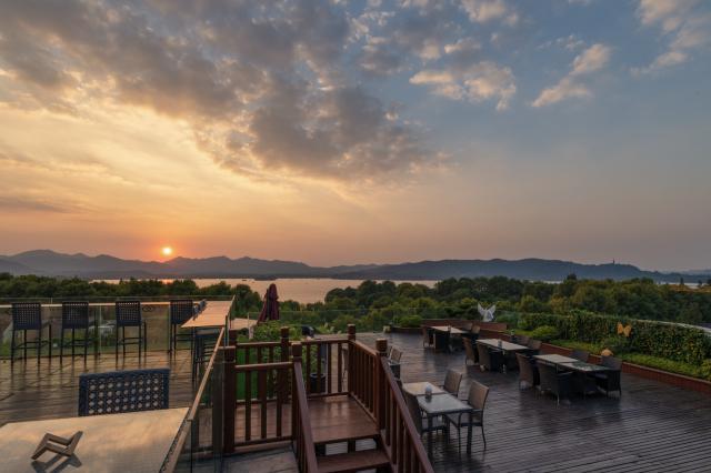 西湖索菲特位置有多好,过马路就是西湖。酒店顶部有一个露台,可以俯瞰西湖的全景,同时这里也是美丽的夕阳。