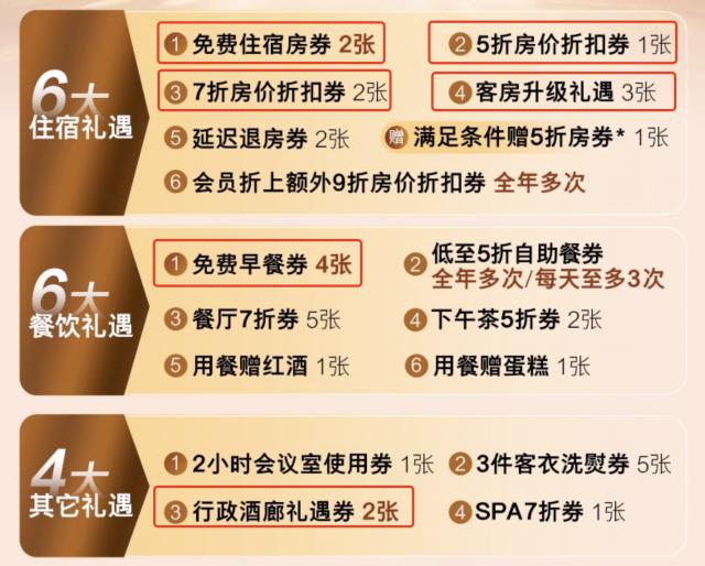 这些权益是主要的:免费房券 2 张、1 张 5 折、2 张 7 折、3 张客房升级,4 张免房早餐,2 优待张行政酒廊。