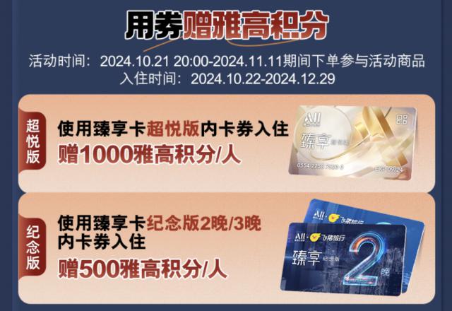 最多可赠 1000 积分 / 人。双 11 购买激活臻享卡超悦版或纪念版,使用超悦版内卡券入住,赠送礼品。 1000 雅高积分 / 人类;使用臻享卡纪念版 2 晚 /3 晚上卡券入住,赠送 500 雅高积分 / 人。每个用户都计入活跃期 1 第二,也就是最多可以赠送 1000 积分 / 人。1000 积分相当于 20 欧洲,下一次住宿时直接扣除 20 欧洲,雅高的积分可以当钱用。