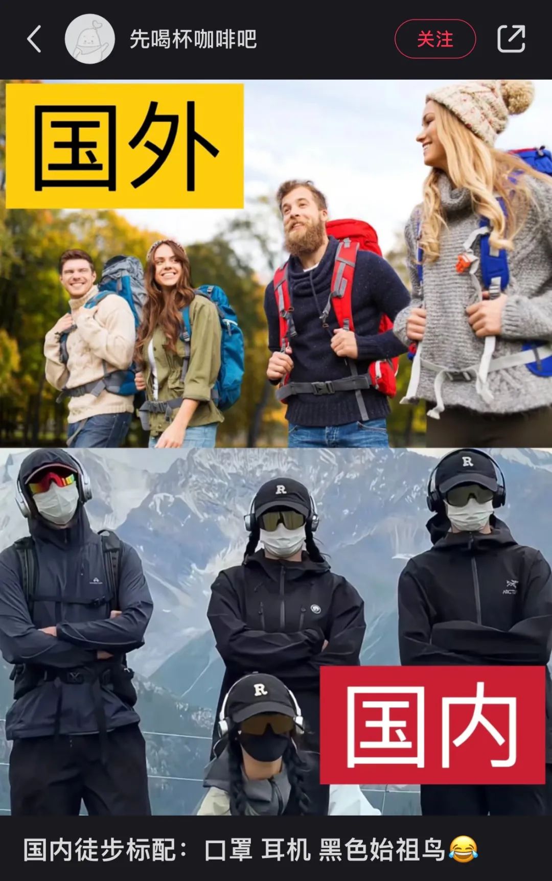 纵观当前社交媒体的宣传,户外宣传「品牌、穿搭」宣传力度远远超过「技术,安全问题」,和一些非户外网络名人博主一样,每个人都穿着始祖鸟爬山爬山,这会让一些人觉得爬山爬山也很简单。当他们去户外时,他们必须穿始祖鸟。