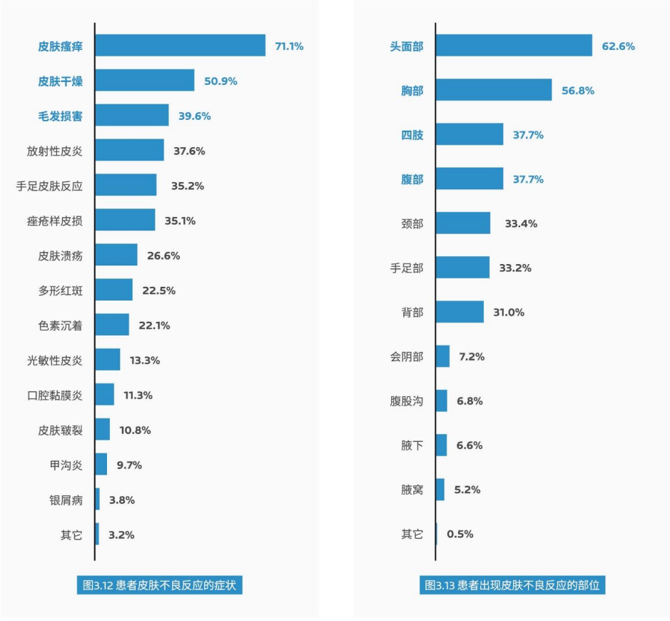 从《2024中国肿瘤治疗皮肤不良反应调查报告》可以看出,皮肤不良反应的种类很多,常见的有皮肤瘙痒(71.1%)、皮肤干燥(50.9%)、头发损伤(39.6%)等。