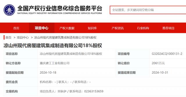 乐居财经 王敏 10 月 18 日,根据全国产权交易中心,凉山州现代住宅建筑集成制造有限公司 18% 股份挂牌转让,底价出售 2061 一万元,转让方为重庆建工工业有限公司,披露起始日期为 2024 年 10 月 18 日至 2024 年 10 月 31 日。