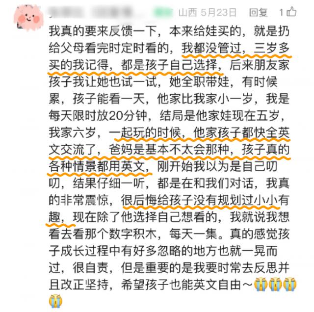 看动画也不是什么痛苦的事。我们每天陪孩子看几次动画,坚持用。 20-30 分分钟磨耳朵,父母也是 0 起点,小孩也是 0 起点,互相理解,互相讨论,竞争学习,一定会极大地鼓励孩子。
