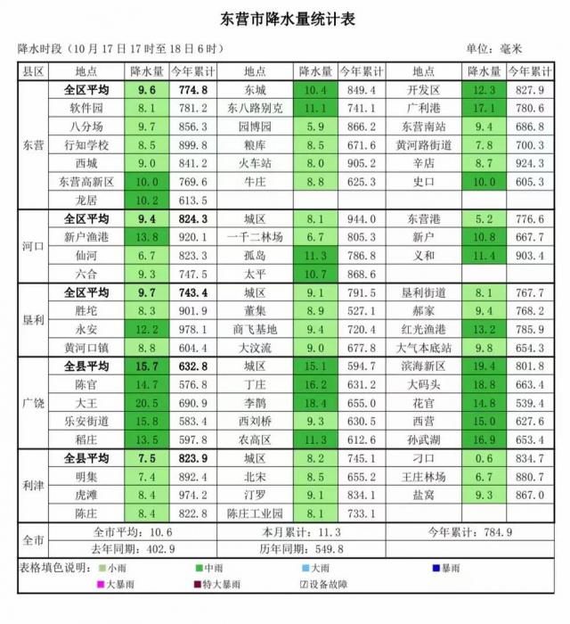 齐鲁网· 闪电新闻 10 月 18 日讯 根据东营市发布的最新雨报,10。 月 17 日 17 时至 18 日 6 当时,全市平均降水量 10.6 mm,最大的广饶老大 20.5 mm。全市 27 一个站点中雨,36 个小雨。今年全市累计平均值 784.9 mm,比去年同期(402.9)更多 382 mm,常年(549.8)较多 235.1 mm。目前间歇性降雨,预计今天上午降雨将持续,全市阴雨,局部大雨,东北风逐渐增大。