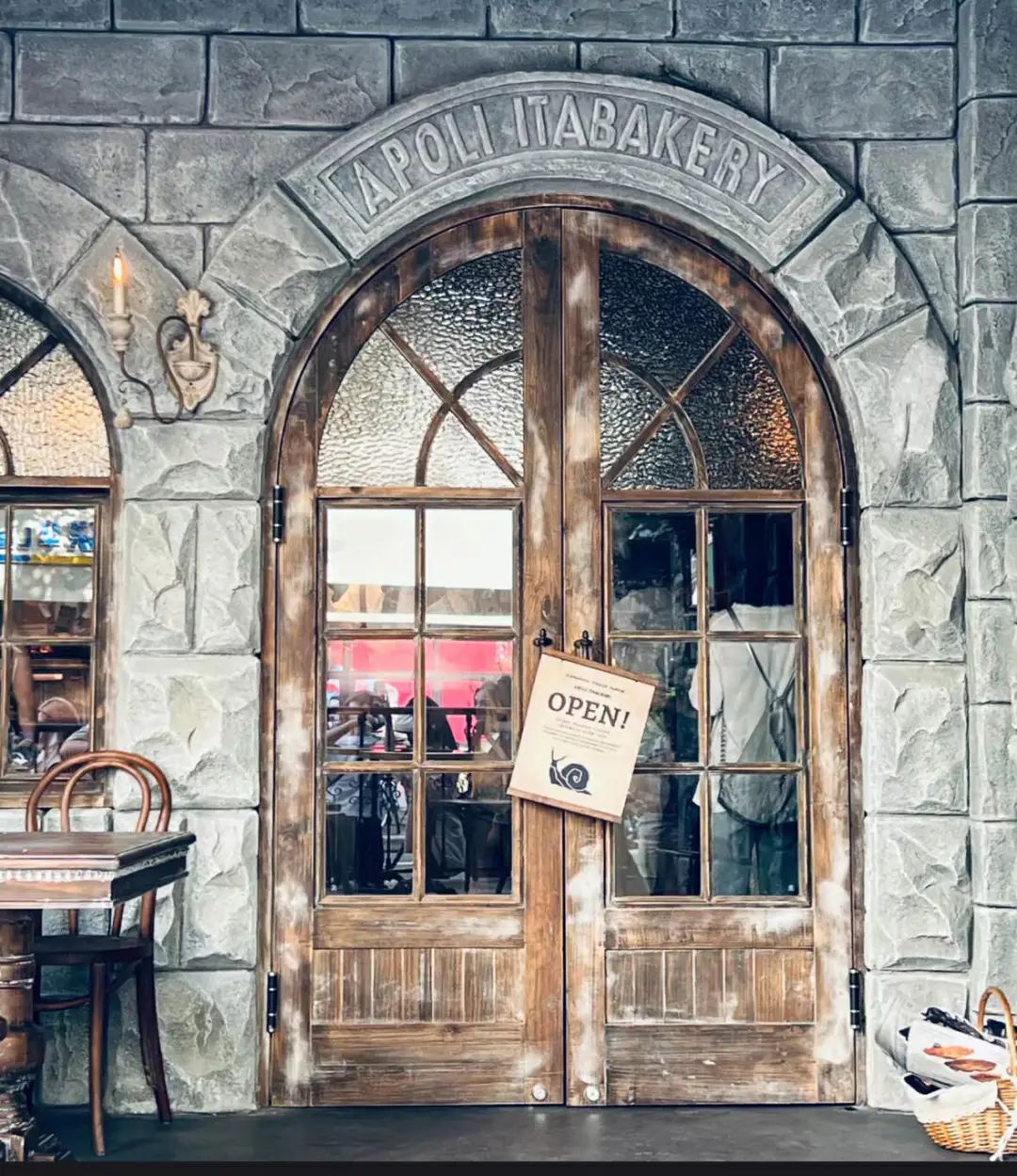 同样的开放式面包柜台,石墙环绕着树枝和干花,协助暖色灯光,在故事书中打造法术面包店。