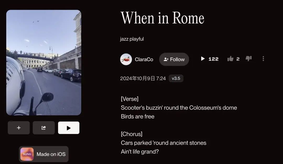 10 月 16 日,Suno 引入了一个新的功能 Suno Scenes——以视频和图片为提示,生成 30 秒的音乐。