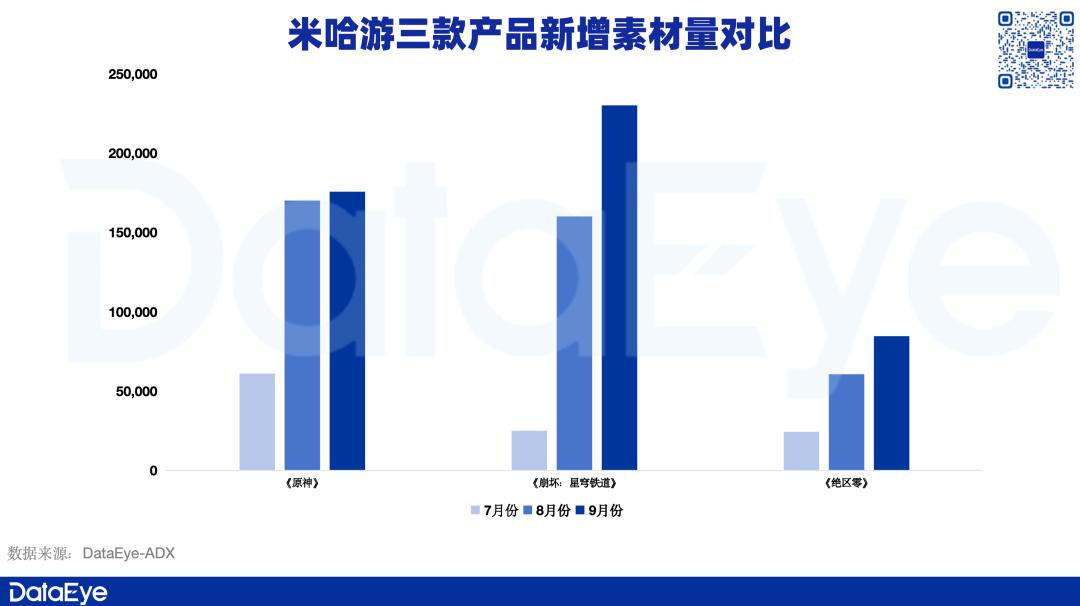 根据时间线,DataEye研究所统计了《原神》、《崩铁》、最近,三款产品“绝区零”新增了材料量,发现从今年7月开始,米家三款产品纷纷增加了材料投入。