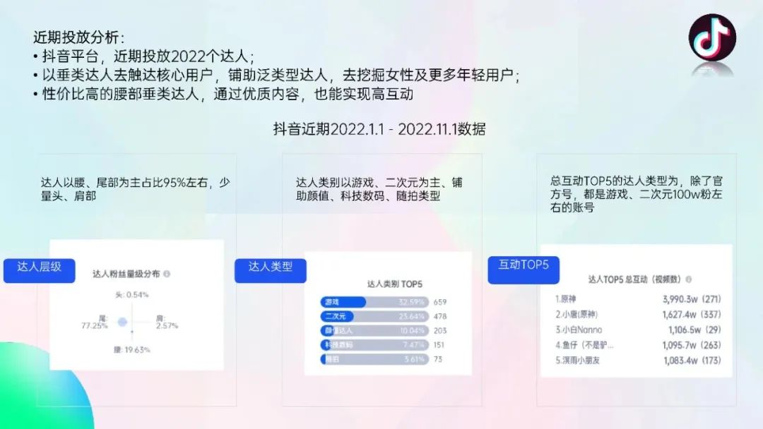 根据一份名为《2023米哈游戏公司大咖采购招标方案》的文件,2022年,米哈游曾在抖音上投放超过2000名大咖,而且效果还不错。但是在这个方案中,除了抖音,还有小红书、快手等平台的大咖投放内容。