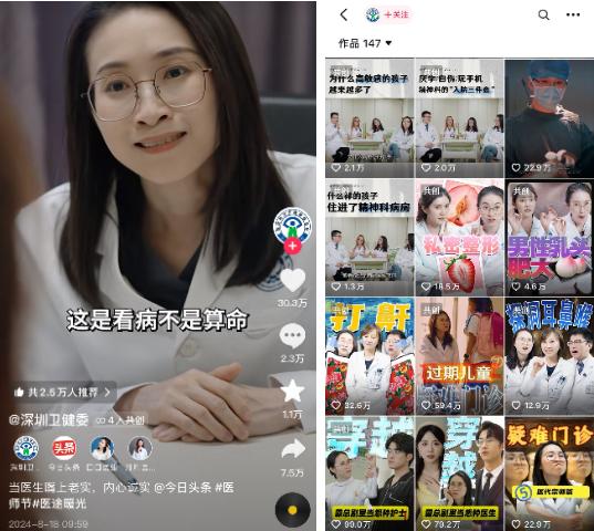 值得注意的是,克劳锐翻阅了许多官方蓝V账号视频,发现跨境营销似乎也是目前官方蓝V探索的新方向之一。罗平交警不仅经常和其他官方蓝V一起创作视频,还邀请其他创作者展示故事导向的宣传视频;深圳市卫生健康委也邀请了@今日头条 参与策划、导演、编剧等内容,@口腔医生 等待创作者出现演绎,发布《当医生内心太诚实》《过期儿童疑难门诊》《穿越到霸总剧中当冤种护士》等视频。这种方法不仅保证了视频内容的质量,而且成为官方号码扩大知名度的渠道之一。