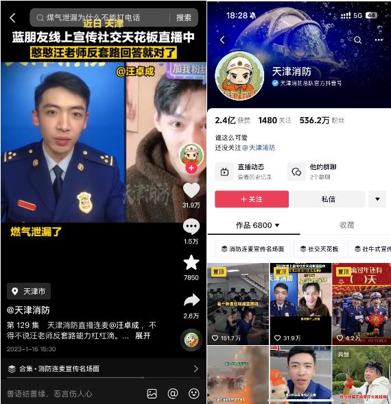 另外@天津消防 在引领大咖和他们粉丝的互动中,他们还创造了几个著名的直播场景,并将这些著名场景的直播切片制作成一系列视频发布进行二次传播。科普宣传面的深度和广度都有了很大的提升,@天津消防 粉丝数量也增加到535.6万,总赞2.4亿。