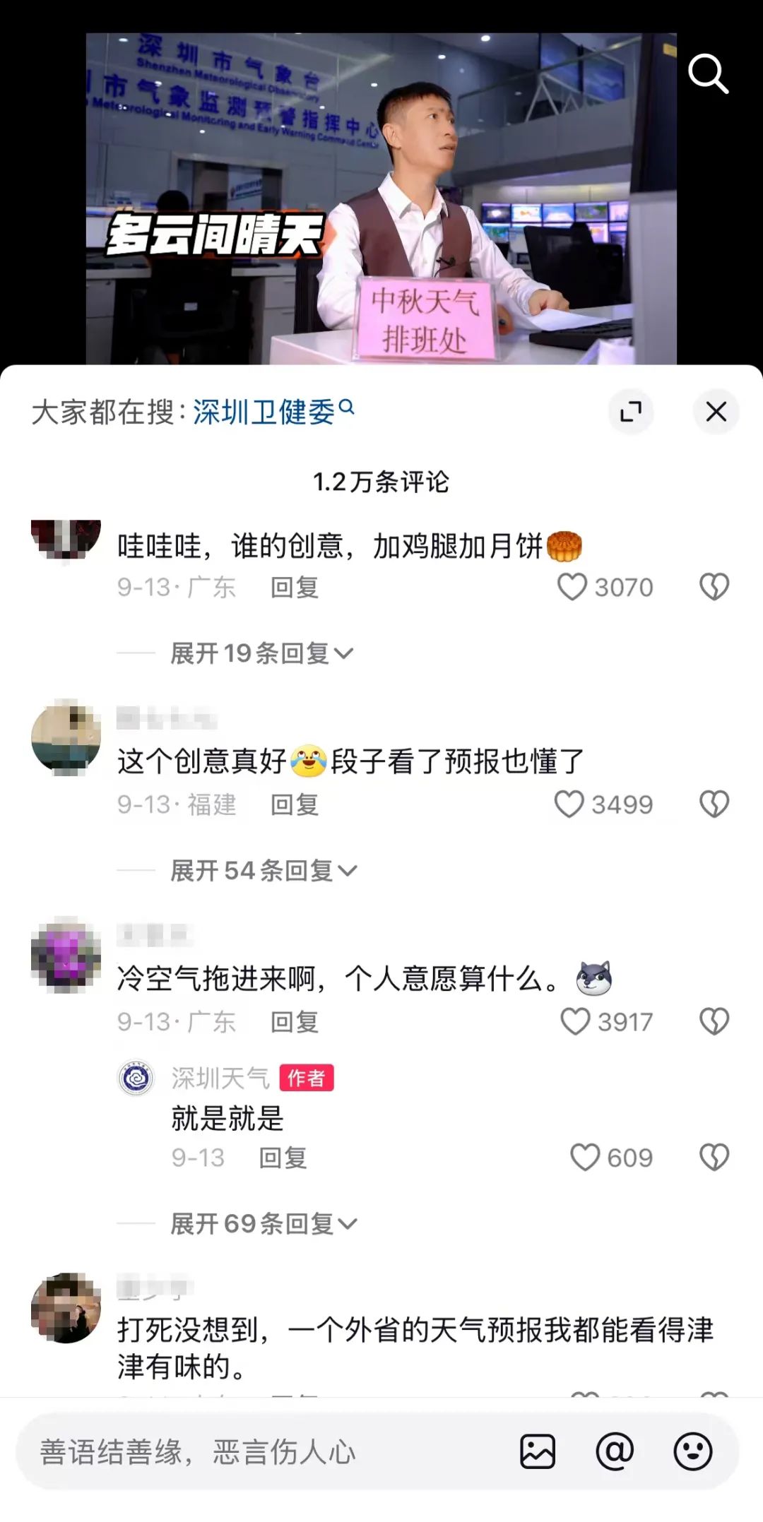 看了深圳天气的帐号,发现@深圳天气 之前就开始创新视频的内容和形式,比如今年中秋节@深圳天气 以排班的形式呈现深圳中秋三天的天气,在贴近生活的情境和有趣的笑话中,悄悄生动地向大家传达中秋三天的天气。到目前为止,这段视频已经获得了9万个赞。网民们也对这种想法表示肯定:“建议全国普及@深圳天气 脑洞,看谁还不喜欢看天气预报?”