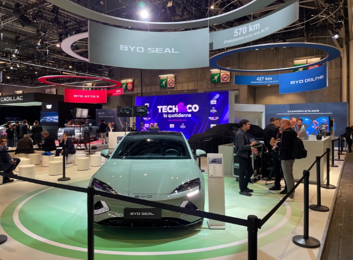 在2024年的巴黎车展上,有20多家汽车公司参加了展览,其中9家是中国汽车公司——比亚迪、红旗、广汽、上汽大通、东风、问界、小鹏、零跑和创维。