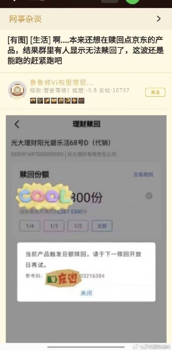 10月18日凌晨,各社交平台流传着一张截图,声称JD.COM金融理财产品高额提现无法赎回。截图显示“当前商品触发巨额赎回,请在下一个赎回开放日再次尝试。”随着舆论的发展,很多网友担心JD.COM金融是否存在排挤。#JD.COM称,金融排挤的谣言是虚假信息#