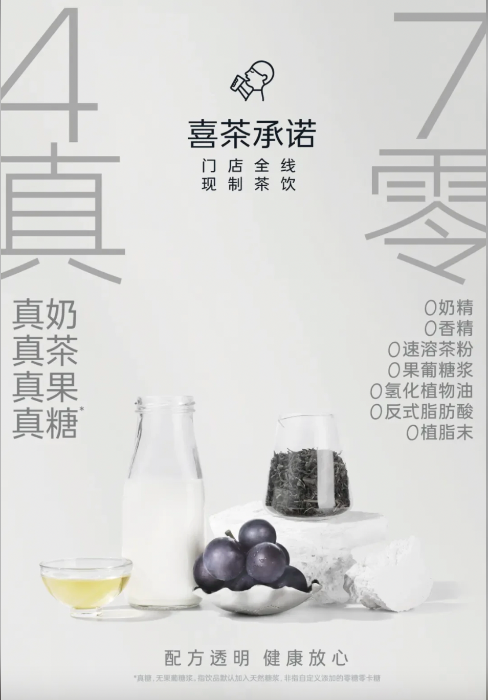 七月二十二日,喜茶公布了更严格的“四真七零”健康茶饮标准。该标准明确指出,健康真茶应以“真茶、真奶、真果、真糖”为原料,全线产品符合“0奶精、0香精、0果葡糖浆、0植物脂末、0氢化植物油、0反式脂肪、0速溶茶粉”的需求。作为一个始终坚持真品质的品牌,西茶全线销售的现制饮品都符合“四真七零”健康茶的标准。