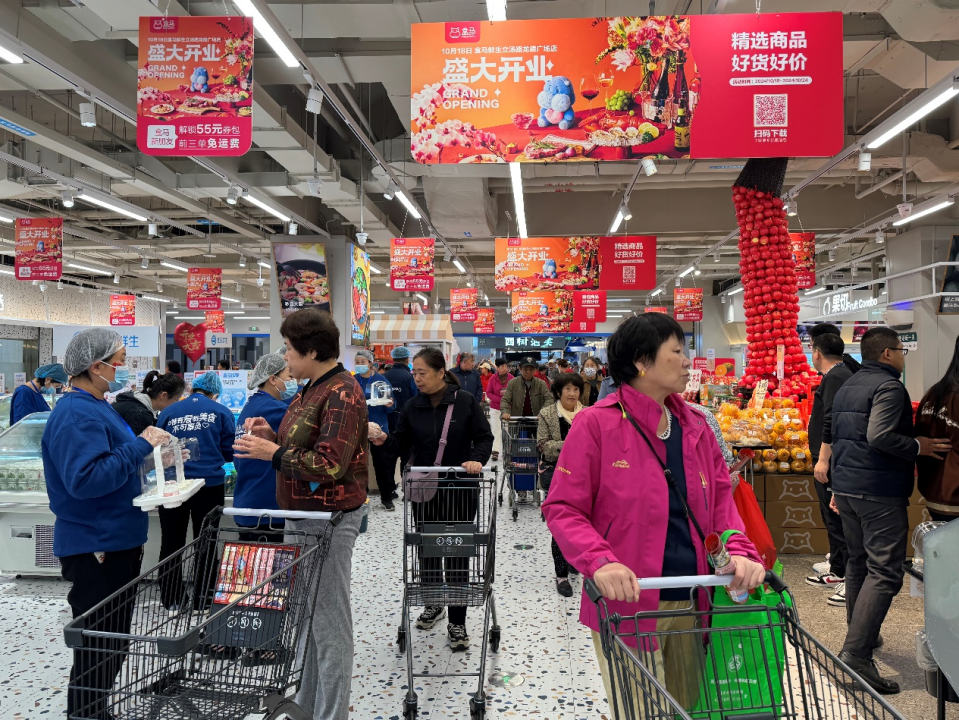 10月18日,位于北京市昌平区立汤路龙德广场一楼的盒马龙德广场开业,一大早就吸引了不少居民前来购物。
