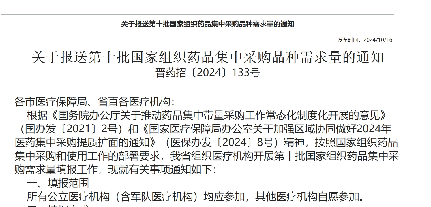 10月16日,山西省药品机械集中招标采购中心发布《关于提交国家第十批药品集中采购类型需求的通知》,要求所有公立医疗机构(包括军事医疗机构)参与,其他医疗机构自愿参与。报告时间从今天(10月18日)到28日,医保部门在11月1日前完成审批。