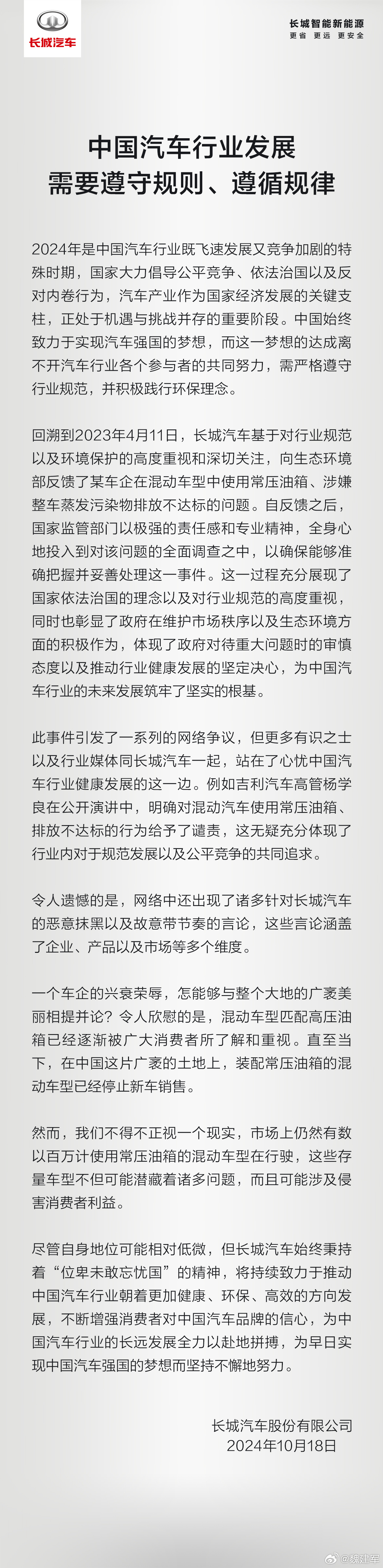 长城汽车董事长魏建军也转发了这篇长文,指出:“中国汽车竞争日益激烈,长城汽车坚持规则和规则,努力促进行业健康发展。”他用哲学语言表达了对企业发展的看法:“如果生活中有广阔的荒野,公司必须按照正确的轨道前进。”