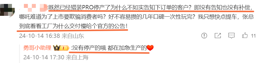 "pro缺配件在网上已经停工很久了,现实中也是很多人等了很久,一点消息都没有。;"既然所有的猎装PRO都停产了,为什么不如实地告诉下订单的用户呢?也就是说,没有通知,也没有补偿。