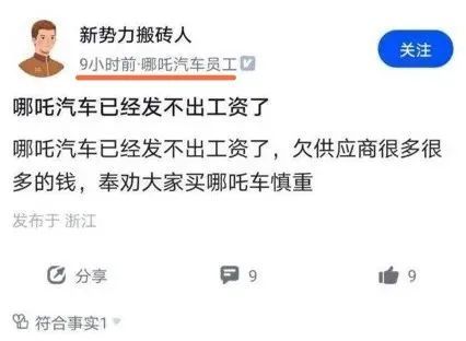 近日,某社交媒体认证为“哪吒汽车员工”的网友爆料:“哪吒汽车不能发工资,欠供应商很多钱。我建议你谨慎购买哪吒汽车。”