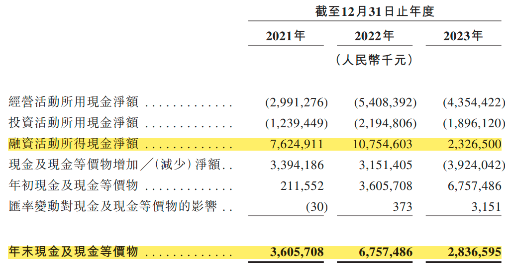 根据招股书,2021-2023年,哪吒汽车融资活动净收入分别为76.25亿元、107.55亿元和23.27亿元。2023年大幅下降。