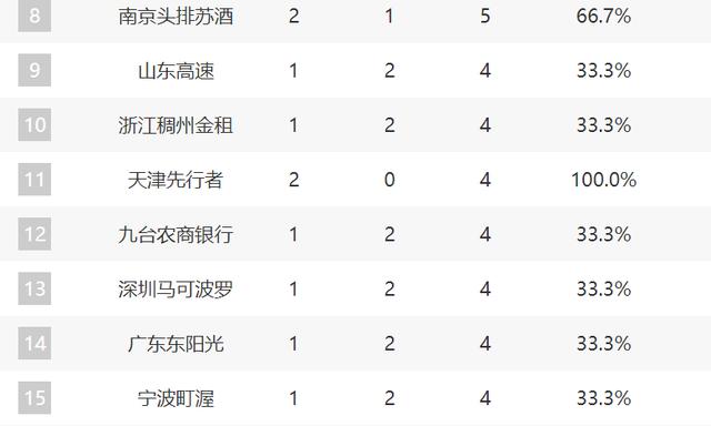 而 9-15 的都是 1 胜 2 输了,但是天津少打了一场比赛,他们两连胜。其中 1 胜 2 山东、浙江、吉林、深圳、广东、宁波是负面球队。这儿的惊喜估计是宁波,他们在第一场比赛中战胜了四川,他们正在稳步前进。但是浙江这个赛季的开场并不好,输给了辽宁和山西,这是季后赛的直接竞争对手。即使琼斯回归吉林,可惜球队的弊端还是相当大的。这一轮深圳战胜江苏,吊打弱旅。在胡明轩爆发的情况下,广东艰难地拿下了青岛,他们这个赛季仍然不容乐观。在张庆鹏的带领下,天津保证了攻击,这一轮险胜上海,两连胜保持了完美的开局。