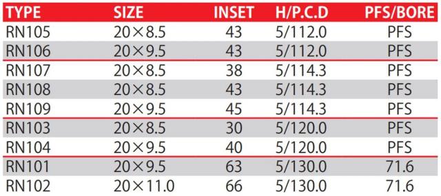 目前 BBS RN 这些数据相当简单,只有 20 寸,总宽从 8.5J 到 11J,孔位不少,5*112/114.3/120/130。