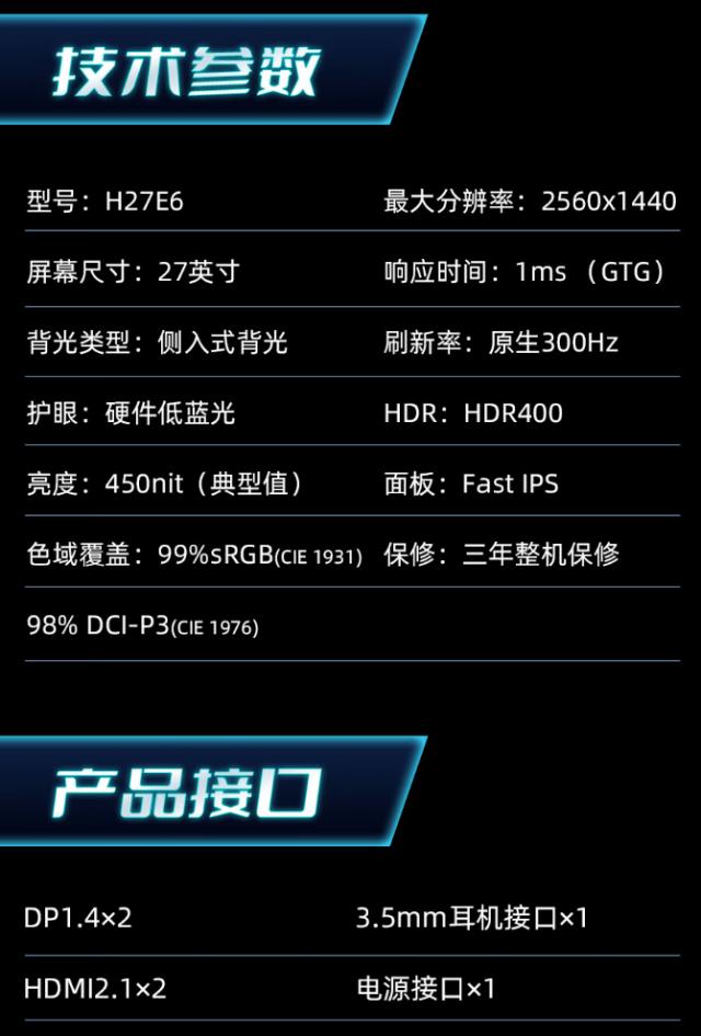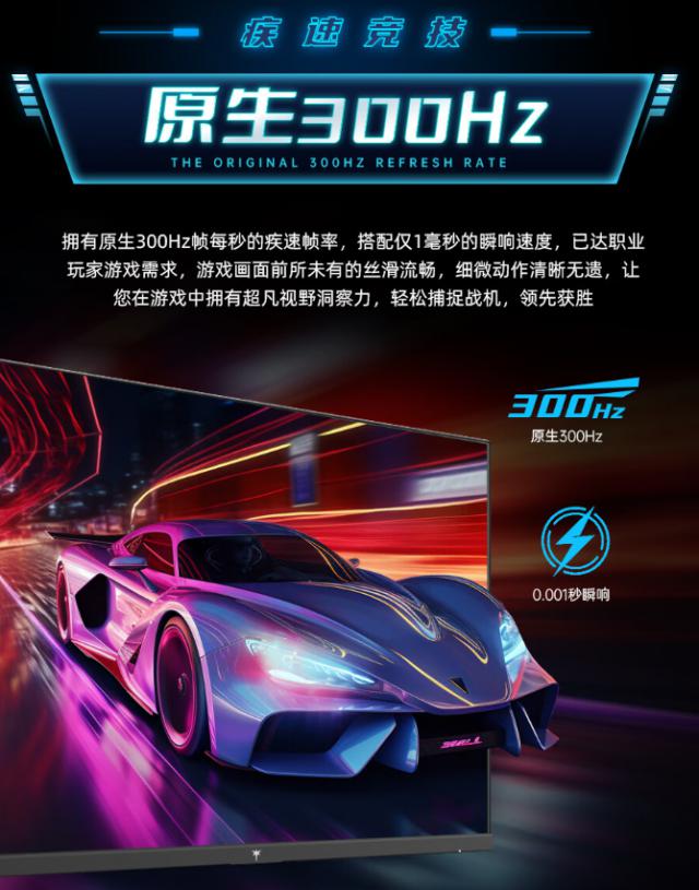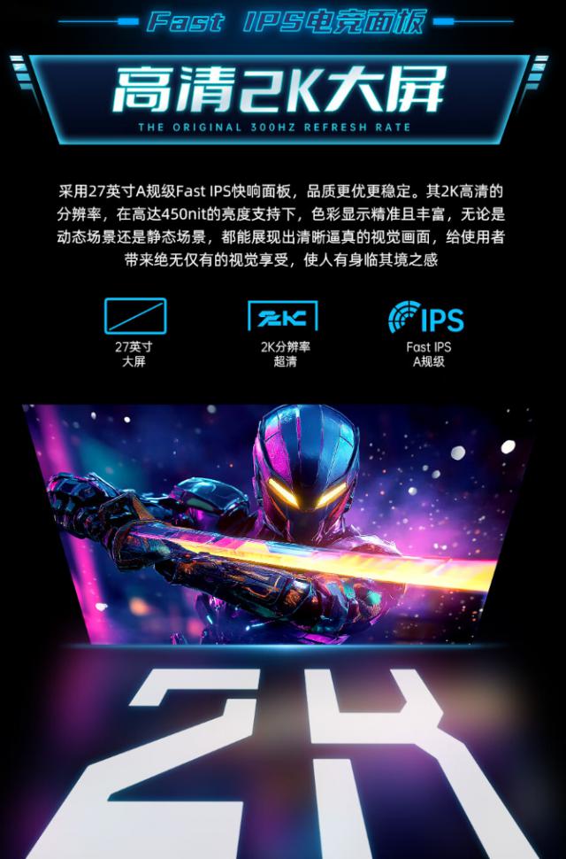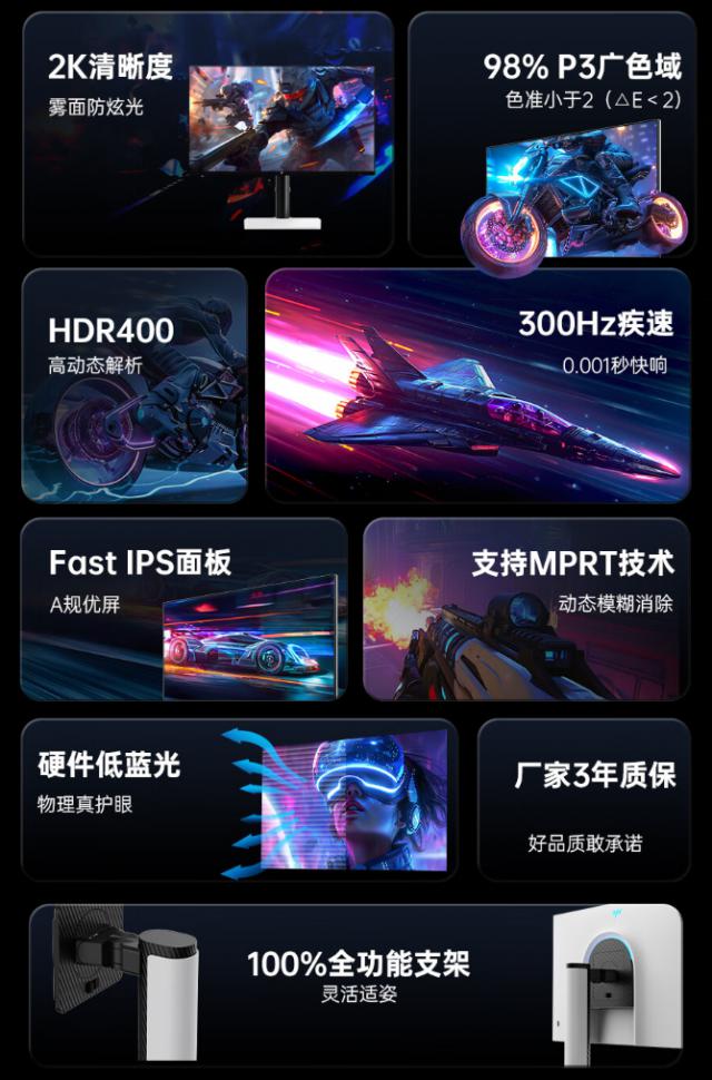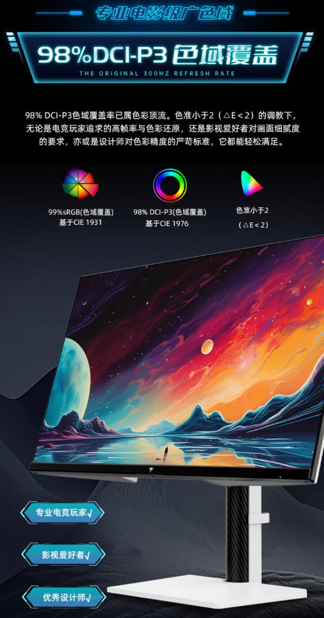 据报道,这个显示屏的选择 Fast IPS 面板,辅以雾面防眩光设计,分辨率 2560 × 1440、支持原生 300Hz 刷新率。显示屏覆盖 98% DCI-P3、99% sRGB 色域,色准 Δ E < 2。