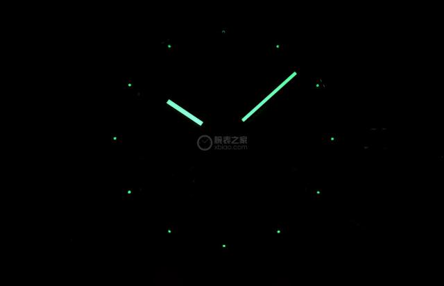白色的抛光镀钒琢型时针和分针覆盖 Super-LumiNova ® 莹光涂料,表盘覆盖 Super-LumiNova ® 莹光涂料