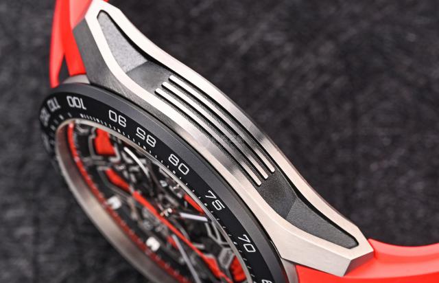 从侧面看,泰格豪雅为这款新计时码表配备了由内部框架和两侧桶形件组成的表壳结构,提高了表壳的层次感。表壳侧面装饰有凹槽设计,让人联想到跑车的进气格栅。制表师用精细的颗粒表面装饰,完成了材料的无缝组合,提高了表壳的耐久性。全面优化的外壳设计是人体工程学的美学。