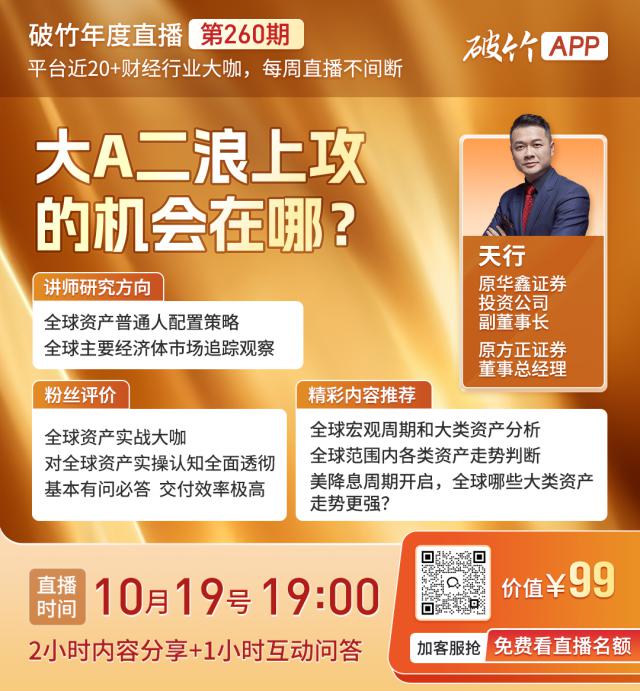 今晚 7 点,在破竹直播间,我们特意邀请了全球资产配置实战大 V “天行总”亲临破竹直播间,带给大家—— A 二浪拉升的机会在哪里?