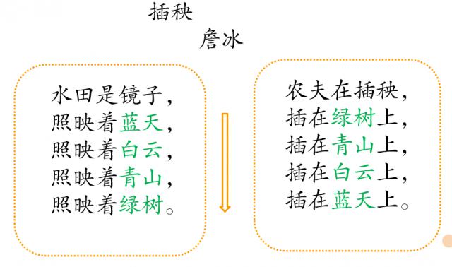《插秧》问题:为什么先插在绿树上?通读诗歌,让学生了解诗歌从上到下从远到近的顺序。